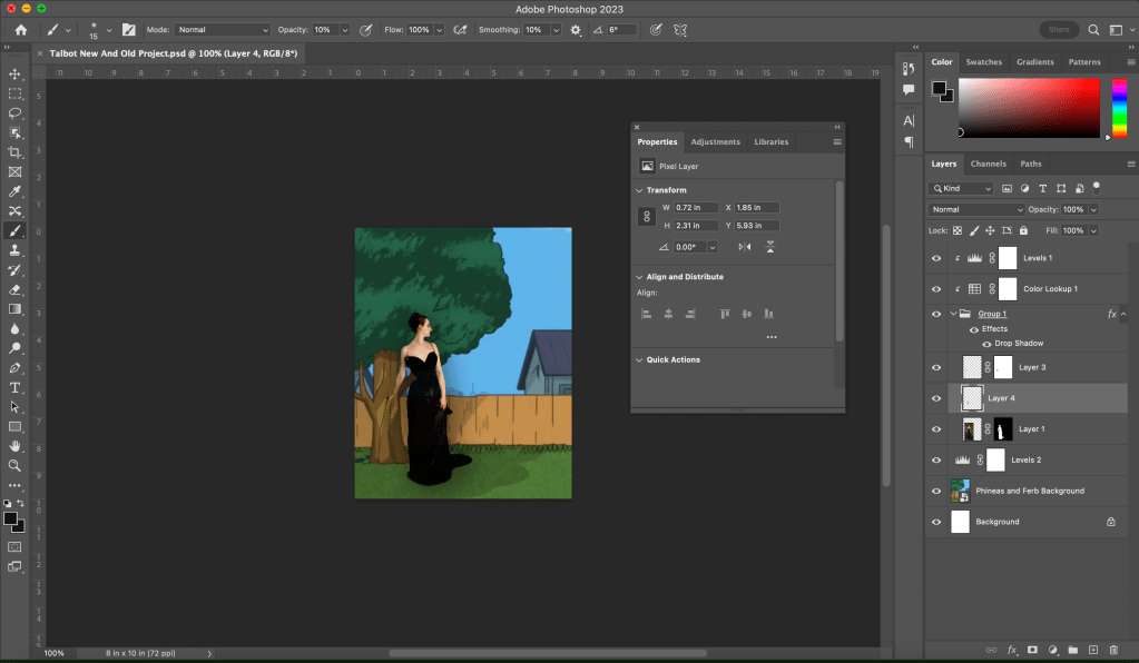 I used the principle of design principle of emphasis for my project. Madame X and the tree are placed horizontally on the left side using the rule of thirds. The audience’s eyes are immediately drawn to the subject resting on the tree. Madame X also has a different texture than the rest of the piece. She is cut out from the original painting using layer masks, so you can see the brush strokes rather than a two-dimensional, square-based background image. In the editing, I added a slight drop shadow to not only accompany the shadow of the tree, but to add dimension to the piece. I also added the “warm colors” LUT and messed with the levels of The Portrait of Madame X. I wanted the cutout to be incorporated into the background, but still be able to see a contrast between the high art image and low art background. I adjusted her hand by rotating it so that it would rest on the tree. In the original painting, her hand was resting on a table. In contrasting culturally bound images, Madame X represents high-income societies. The cartoon background represents low-income societies. By adding the high art cut out of The Portrait of Madame X to the Phineas and Ferb background, I am bringing in a high-income image into a more accessible context for low-income societies.