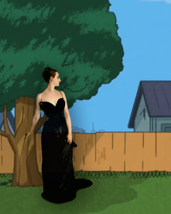 My piece creates contrasts by combining culturally bound images because cartoons are available to the masses whereas portraits and fine art is found in museums. In my work, I placed the woman in a more colorful environment. I want the woman to look higher in status compared to the rest of the piece. Of the artists we explored, Kehinde Wiley did something similar by, “replacing the European aristocrats depicted in those paintings with contemporary black subjects.” Wiley’s pieces “are set against contrasting ornate decorative backgrounds that evoke earlier eras and a range of cultures,” (Brooklyn Museum). By adding The Portrait of Madame X to Phineas and Ferb’s backyard, I am making this fine art piece more understandable for a broader audience. In no real-world situation would you find this prestigious woman in an environment like this. Another inspiration I had during this process was Alexey Kondakov. Kondakov takes high art subjects from powerful paintings and adds them in ordinary, modern locations. By doing this, Kondakov is making these subjects more relatable.